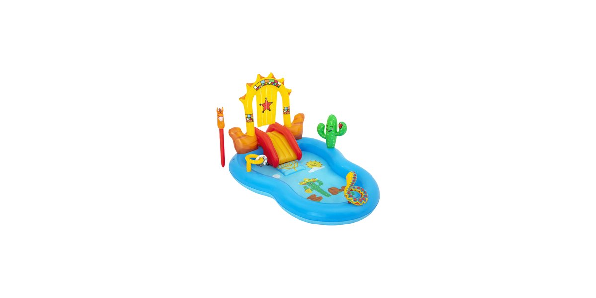 ריכת פעילות להנאה ומשחק בעיצוב המערב הפרוע מבית BESTWAY. כללת מתז מים, מגלשה, חישוק מתנפח ומקל רכיבה מדליק בצורת סוס. מתאים לגילאי 2 ומעלה ֿ