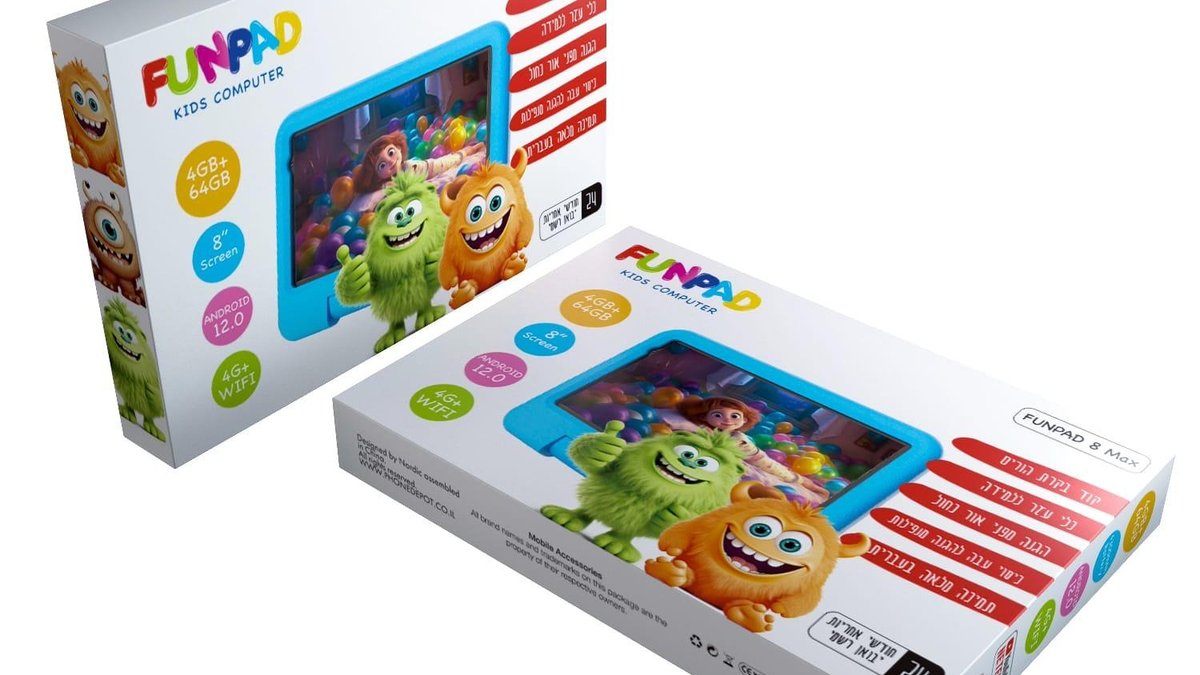 טאבלט דגם FunPad 64GB , כרטיס סים, כיסוי מגן קשיח המותאם לילדים ולהגנה מירבית , מטען וכבל טעינה USB , חוברת מידע משולב