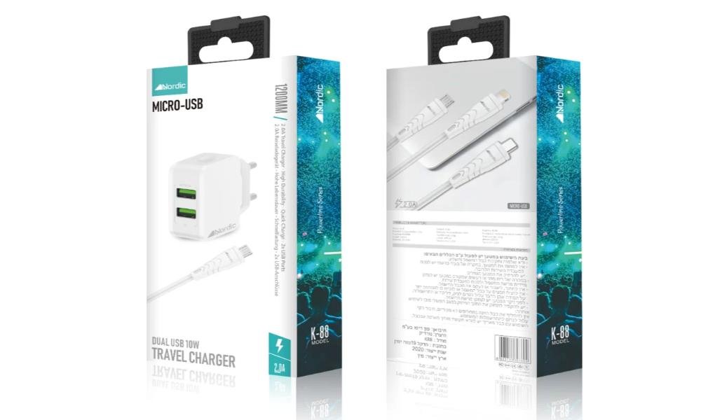 מטען בית חכם שתי יציאות USB טעינה2A + כבל MICRO TO USB איכותי באורך 1.2 מ’ מבית Nordic