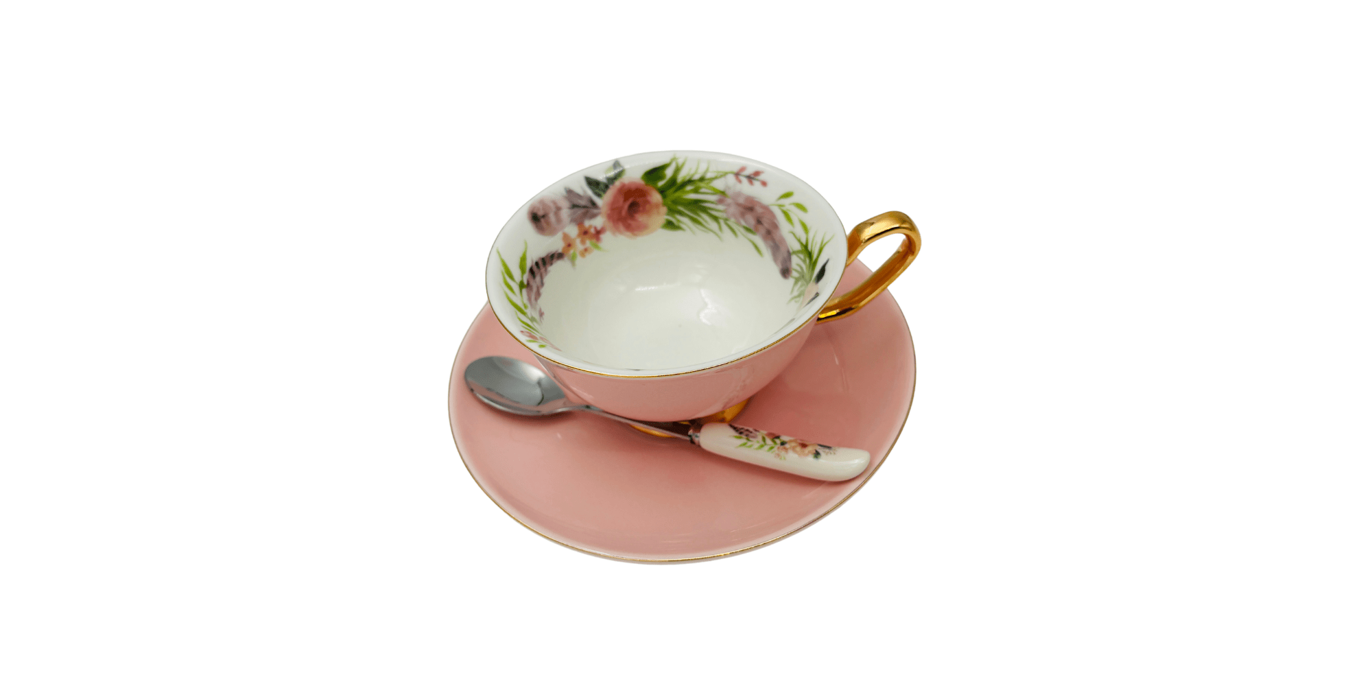 ספל קפוצ’ינו – מעוצב מפורצלן בצבע ורוד רך ועדין עם ציורי פרחים וכפית תואמת מפורצלן איכותי